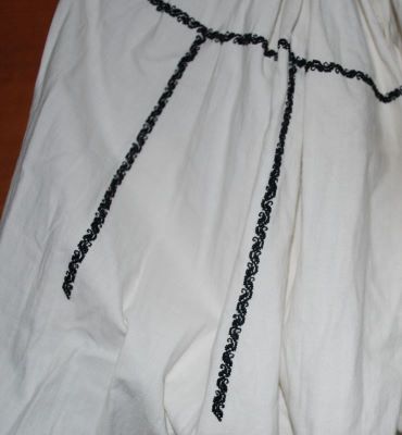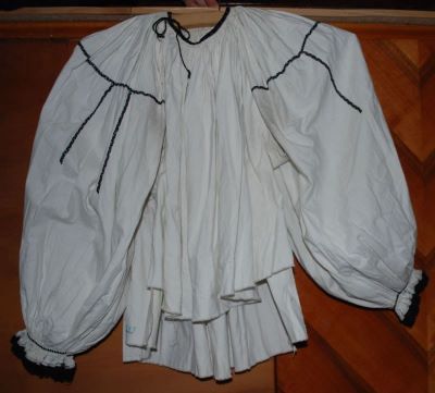 Descriere: Croi de tip carpatic, confecționată din mai multe bucăți de pânză industrială (giolgi) unite între ele prin cusătură tighel pentru a forma mânecile (o foaie), fața și spatele din câte o foaie foarte lată. Toate bucățile sunt încrețite în jurul gâtului și fixate sub un guler betiță, îngust. Mânecile se termină cu "fodori"/volan, format prin încrețirea materialului și fixarea crețurilor prin cusătură decorativă pe muchia lor; marginile volanului sunt finisate prin tivire și aplicare de dantelă croșetată. Gura cămășii este lateral-dreapta; se închide cu 2 șnururi. Decorul este plasat pe mâneci: "șir peste umăr" din care coboară 5 râuri scurte, pe crețurile mânecii și pe guler. Motive decorative vegetale: vrej cu frunze și cârcei (mânecă); geometrice: romburi cu creste (guler). Cromatică: pânză albă, motive cu negru, albastru, mov, maron, dantelă neagră.