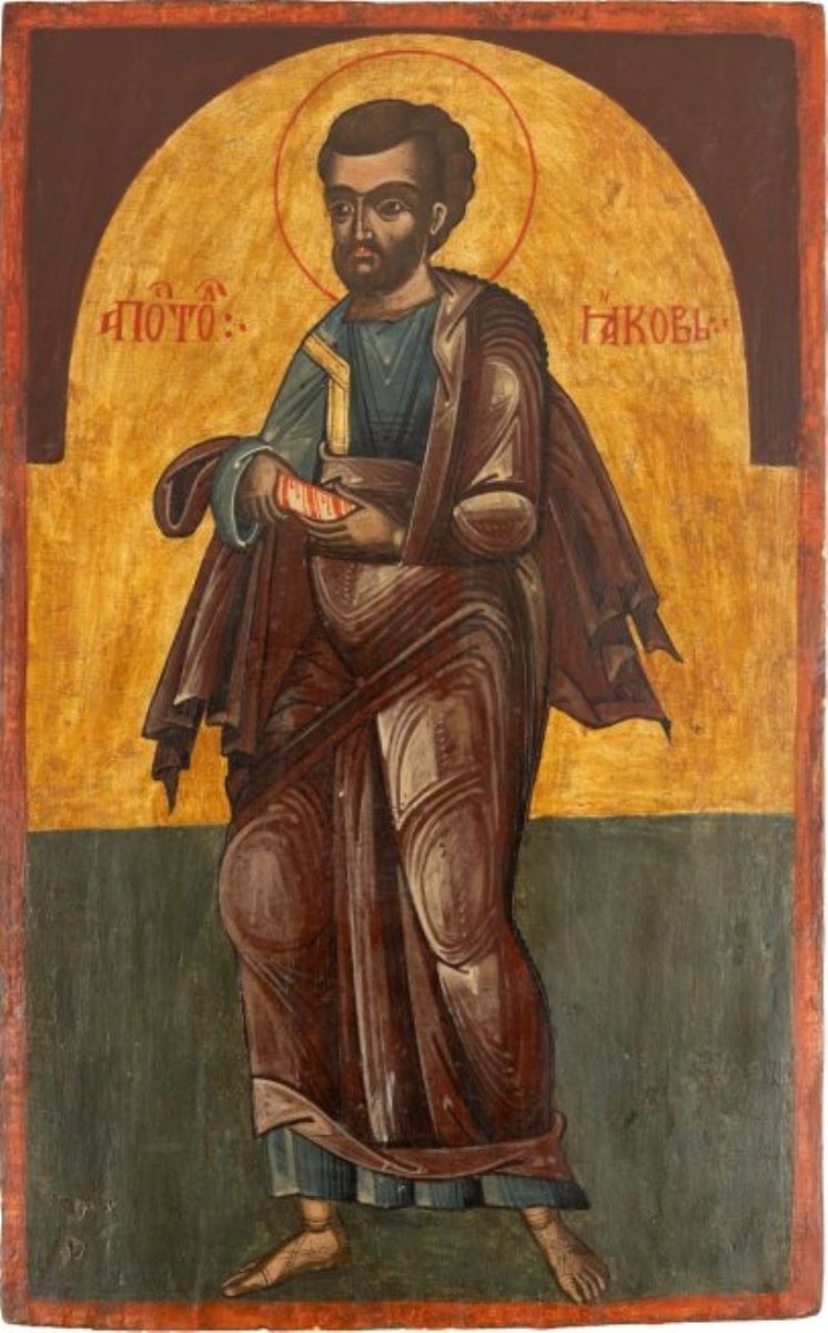 Descriere: Icoana Sfântului Apostol Iacob este serie cu icoana Sfântului Apostol Simon; au făcut parte din aceeași friză a Apostolilor, aparținând aceluiași iconostas realizat în stil brâncovenesc, fiind pictate în aceeași perioadă și de același zugrav anonim. Apostolul este redat în aceeași atitudine: în picioare, pe un fond galben-auriu în partea superioară a icoanei și verde în partea inferioară, fiind orientat spre stânga. Cu ambele mâini ține un rotulus. Poartă un chiton albastru și un himation violaceu, iar cutele unghiulare ale veșmintelor sunt redate cu aceeași culoare, în nuanțe mai închise pentru zonele de umbră și mai deschise pentru cele de lumină. Conform Ereminiei, este reprezentat cu părul și barba castanii, iar trăsăturile chipului și modeleul acestuia sunt executate în conformitate cu stilul picturii brâncovenești. În jurul capului poartă o aureolă delimitată de fondul icoanei printr-o linie roșie. Inscripția care desemnează numele sfântului este pictată cu roșu, cu litere chirilice, în limba română. Un chenar pictat cu roșu încadrează, pe margini, câmpul icoanei.