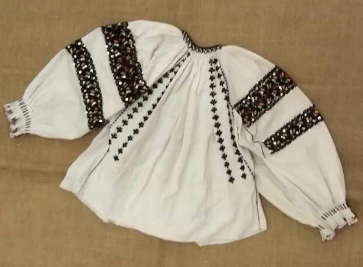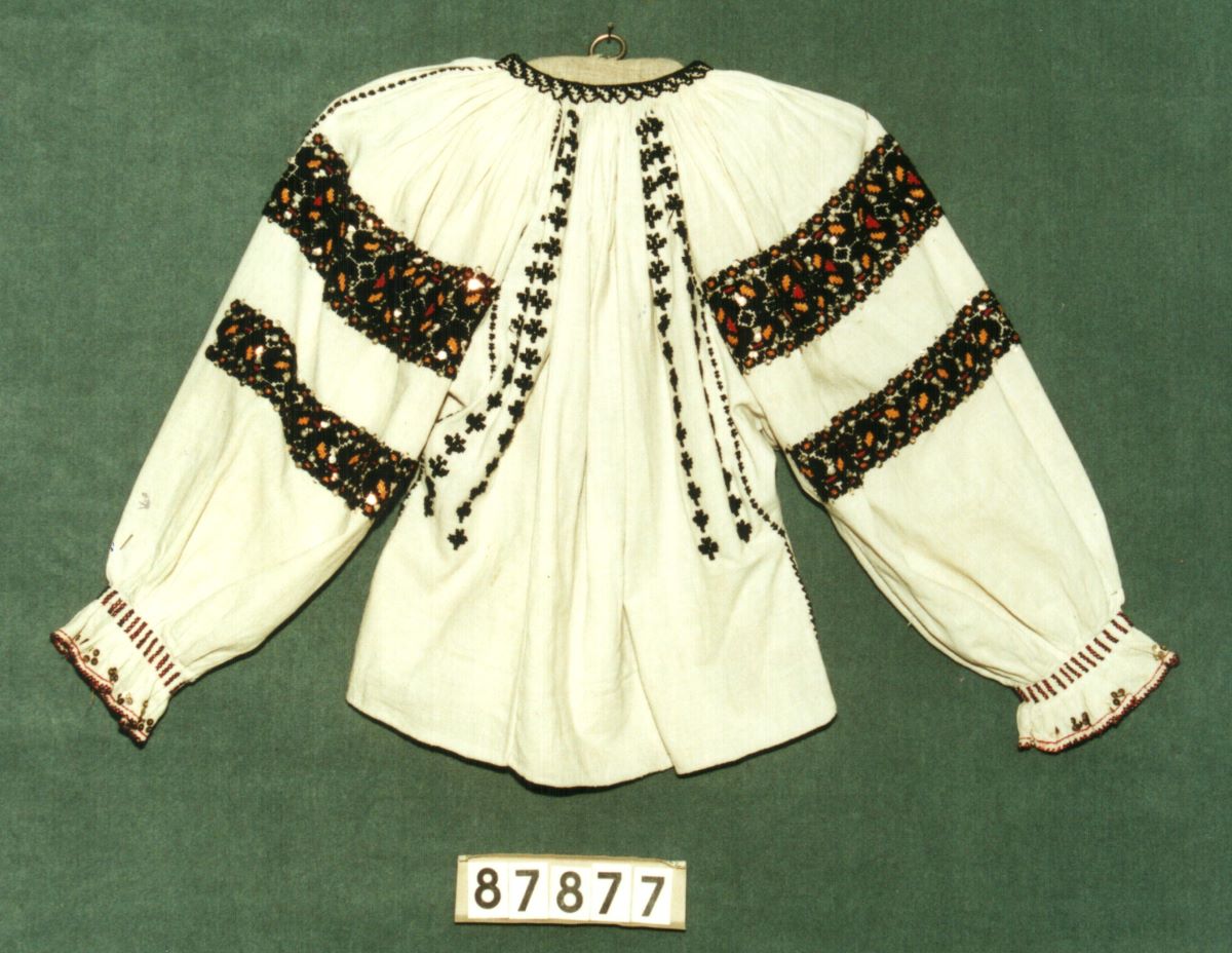 Descriere: Părțile componente sunt strânse în jurul gâtului pe încreț cu zigzag și bentiță, întrerupt la gură 0,18 m. Sub încreț sunt patru șiruri de motive florale stilizate. Pe clinii laterali ai spatelui, sunt cusute câte două șiruri de cruciulițe negre, alternate cu spații albe. Mâneca are două registre peste cot, cu motive florale stilizate, cusute cu negru, galben, roșu, fluturi argintii și terminație cu pliuri, care formează brățara și volanul. Alb, roșu, negru, galben, argintiu.