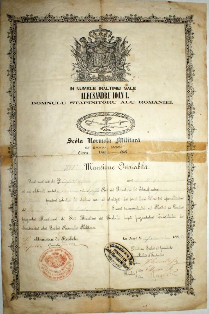 Descriere: Documentul este redactat în limba română, pe o filă in-folio, fiind eliberat de Școala Normală Militară „Sf. Sava” din Iași, la data de 27 iunie 1865, în numele domnitorului Alexandru Ioan Cuza, conform uzanțelor epocii. Sunt consemnate două ștampile. În tuș roșu: „Școala Normală Militară. Scrimă, gimnastică și tragere la țintă Iassy” și în tuș negru: „Manollescu Ion. Director Școlei Normală Militară din Iassy”. Cuprins: În numele Înălțimii sale Alecsandru Ioan I, domn și stăpânitor al României este acordată de către Școala Normală Militară „Sf. Sava” din Iași, Mențiune onorabilă, nr. XVI, care a fost obținută de: „caporalul Pătriu George“ din: „Regimentul 4 Infanterie”, care a primit calificativul: „Bine” cu: „31 puncte“ la clasificarea: „ bine la tragerea la țintă” pentru silința la studiu, atestată de „prea bun elev în specialitatea de: „bun trăgătoriu la țintă”. Ca o recunoaștere a meritelor sale i se înmânează prezenta mențiune de către Ministrul de Război, în urma aprobărilor Consiliului de Instrucție al Școlii Normale Militare. Din partea ministrului de Război semnează inspectorul general Ionescu, iar din partea Școlii Normale Militare, semnează directorul acesteia și președintele Consiliului de Instrucție, căpitan Ion Manollescu și doi membrii ai Consiliului de Instrucție. Formularul diplomei a fost tipărit la „Imprimeria A. Bermann” din Iași. Textul este încadrat de un chenar fitomorf, care are în patrea centrală superioară stema Principatelor Unite ale României, precum și pe cea a Școlii Normale Militare „Sf. Sava” din Iași.