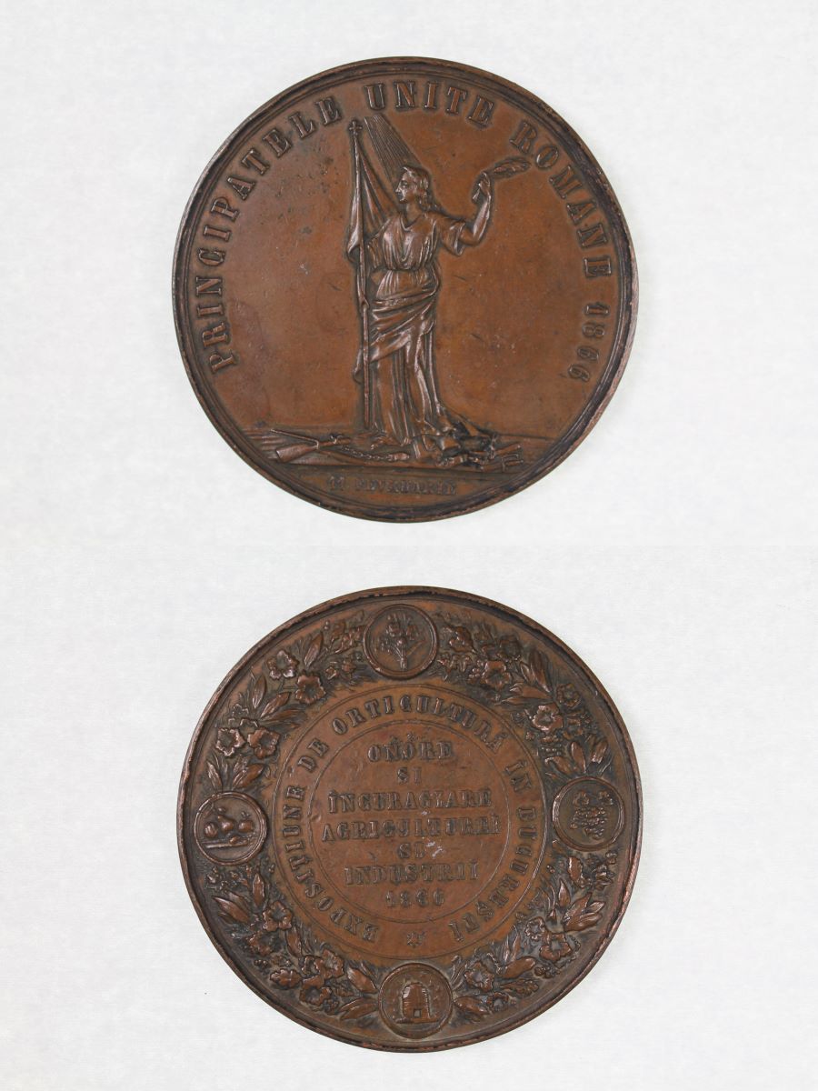 Legendă revers: În banda centrală - EXPOSIȚIUNE DE ORTICULTURĂ ÎN BUCUREȘTI *, iar în centru - ONÓRE / ȘI / ÎNCURAGIARE / AGRICULTUREI / ȘI / INDUSTRII / 1866.