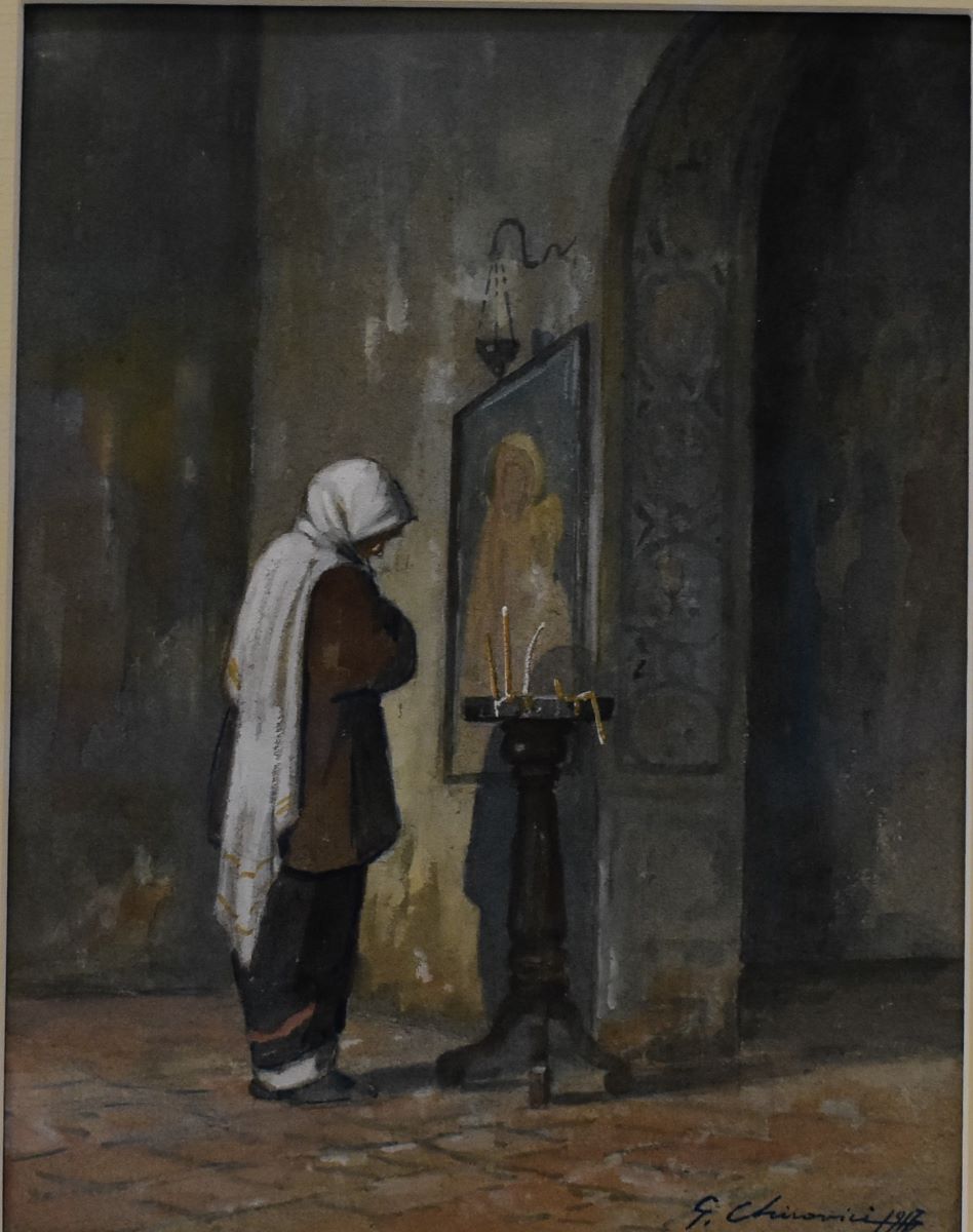 Descriere: Portret întreg de țărancă în interior de biserică. În prim plan, pe un paviment văzut în perspectivă, central spre dreapta lucrării, o țărancă în port popular românesc de iarnă, cu maramă albă prinsă la spate, văzută din semiprofil cu spatele, cu brațul drept strâns la piept și capul ușor aplecat, se închină în fața unei icoane. Personajul este pe alocuri conturat cu tuș albastru. Lângă personaj, poziționat central, un sfeșnic cu lumânări aprinse și corp din lemn, cu trei picioare. În planul secund perete de biserică construit în perspectivă, pe oblică, pe care este așezată o icoană cu Fecioara și Pruncul, cu o candelă în planul superior. În fundal zidul bisericii executat în tușe rapide care sugerează pictura murală. Pensulație vibrată, tușă variată, rapidă. Culoare aplicată în strat variabil, subțire. Compoziție echilibrată cromatic: tonuri de albastru, griuri, brun, ocru, tonuri de roșu, alb. Manieră realistă. Semnat și datat dreapta jos, cu tuș, în peniță, G. Chirovici, 1917.