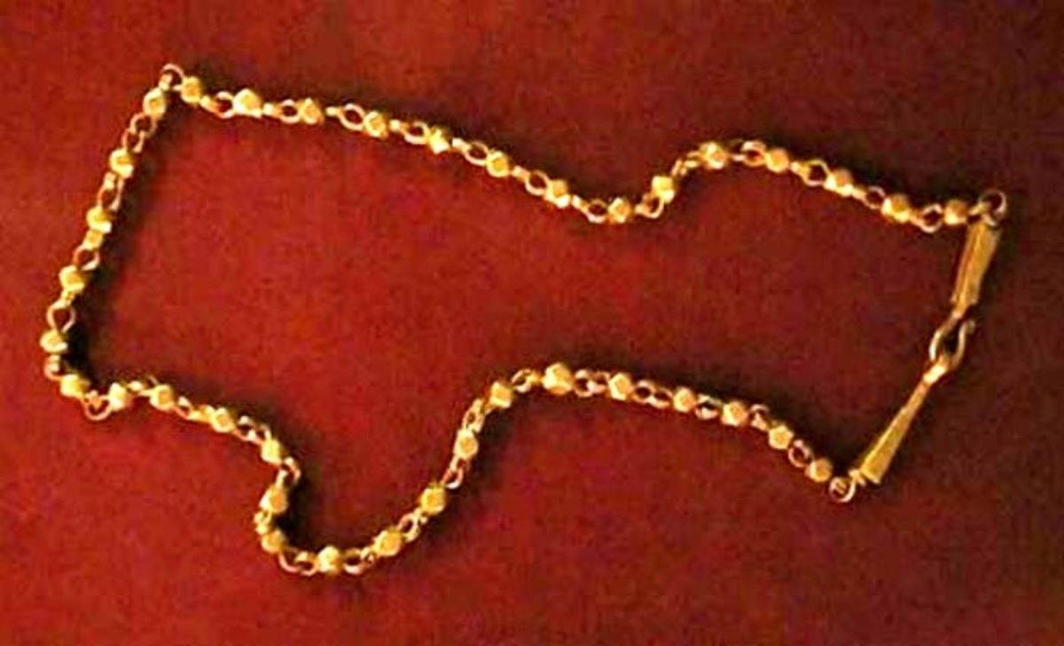 Descriere: Colier din 37 de mărgele poliedrice din aur prinse cu verigi duble; închizătoarea de formă piramidală. La capat cârlig și anou.