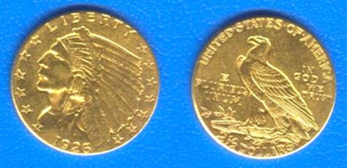 Legendă revers: Deasupra, spre marginea flanului, semicircular, legendă pe un rând UNITED - STATES OF - AMERICA. Jos, semicircular, legendă pe un rând 2 1/2 DOLLARS. Deasupra B.L.P. În fața vulturului legenda pe trei rânduri E/ PLURIBUS/ UNUM. În spatele vulturului legenda pe patru rânduri IN/ GOD/ WE/ TRUST (moto).