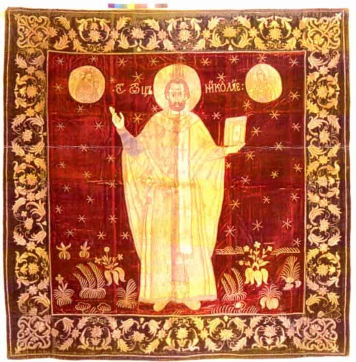 Descriere: Piesa face parte din colecția de broderii provenind de la Biserica Trei Ierarhi, danii ale voievodului Vasile Lupu către ctitoria sa de la Iași. În centrul compoziției este reprezentat marele ierarh Nicolae, în costum de arhiereu, binecuvântând cu mâna dreaptă, în stânga ținând evanghelia. În partea superioară - în medalioane - sunt brodate chipurile lui lisus și al Maicii Domnului. Decorația câmpului central și al chenarului a fost executată după același carton ca în cazul celorlalte broderii provenind de la Trei Ierarhi. Datarea s-a făcut prin analogie cu piesele care poartă inscripții de danie și data.