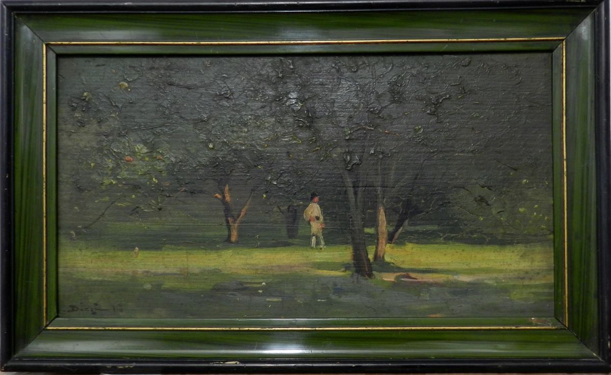 Descriere: Peisaj cu trei planuri pe orizontală, ce redau marginea unei păduri umbroase. În centrul compoziției se află un personaj îmbrăcat în haine tradiționale. Planurile sunt delimitate de o zonă puternic luminată. Predomină tonurile de verde închis și negru. Vegetația este pusă în evidență de pensulația în relief.