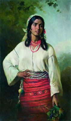 Descriere: Figură idealizată de țigancă tânără în peisaj, îmbrăcată în port popular. Este redată din trei sferturi, în picioare, frontal, cu mâna stângă în șold și capul ușor răsucit spre dreapta, zâmbește. Tip de frumusețe orientală, poartă pârul pieptănat în două cozi lungi răsucite, năframă colorată specifică, ie și catrință. La gât șiraguri de mărgean și în mâna dreaptă, un paner cu struguri. În fundal vegetație. Pictură de factură lisă, de detaliu, cu o gamă cromatică armonică, de culori calde și reci.