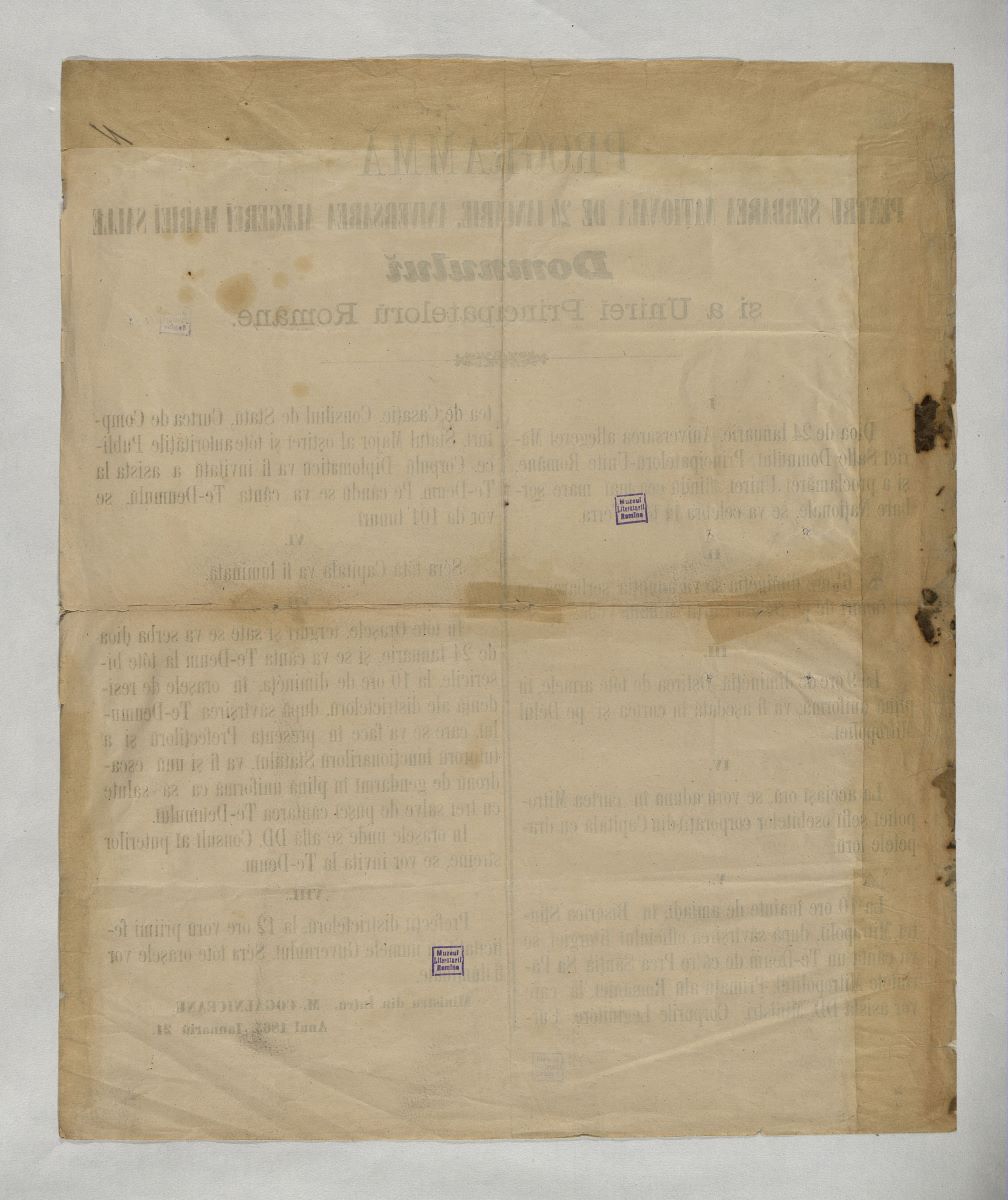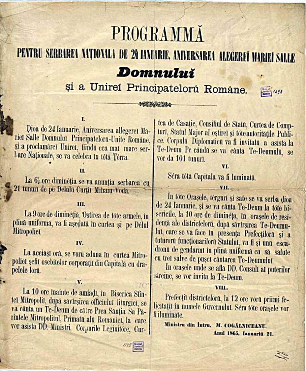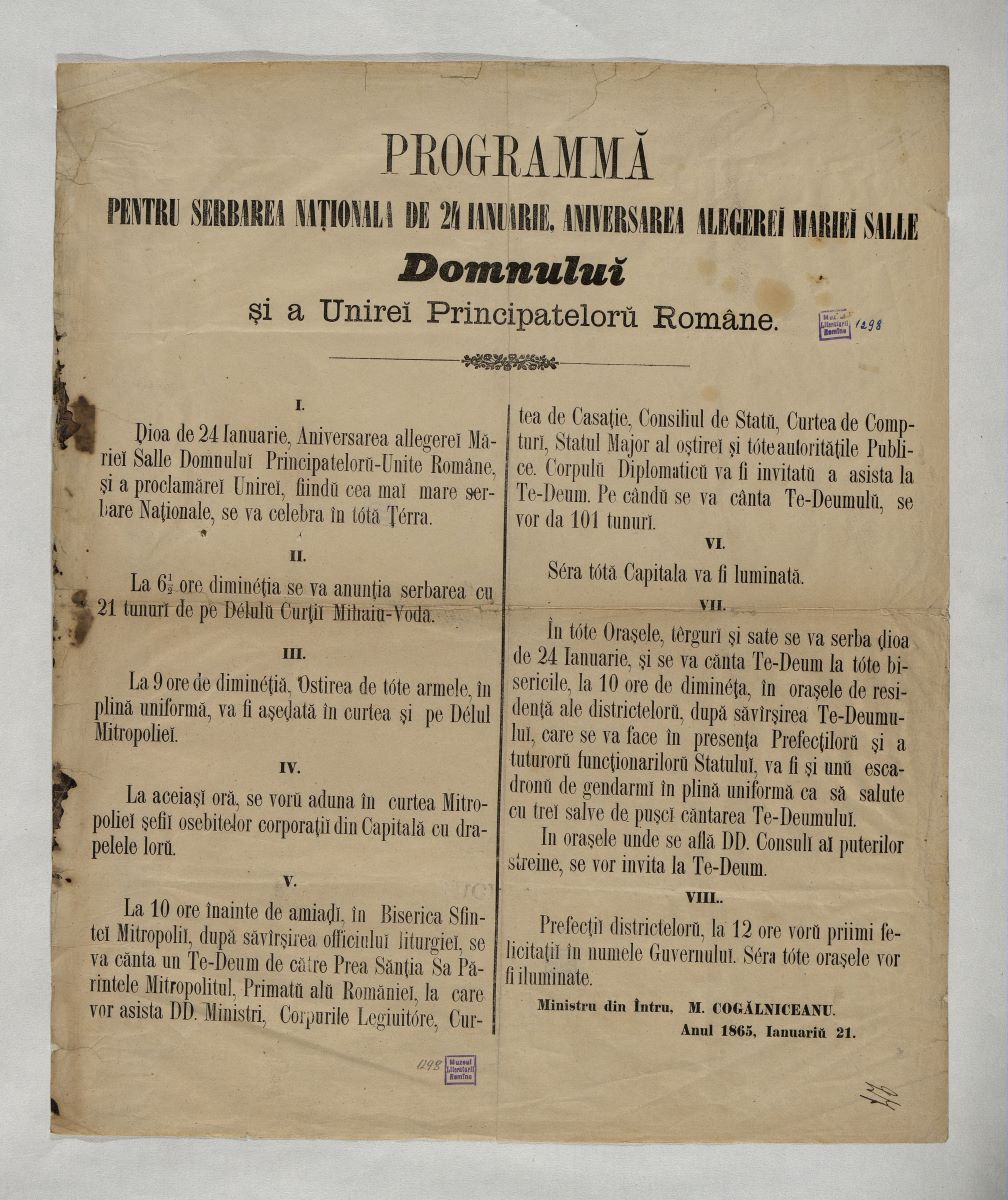Titlu: Anunț al ministrului de interne M. Kogălniceanu privind serbarea națională din 24 ianuarie 1865, reprezentând alegerea ca domn al lui Alexandru Ioan Cuza și a unirii Principatelor Române