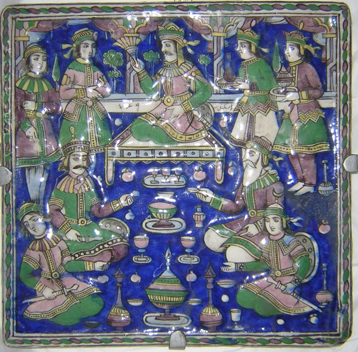 Descriere: Pe fond albastru, scenă de banchet într-un interior. În partea superioară, central, un personaj așezat pe tron, văzut din profil stânga, este flancat de câte doi slujitori. În spatele lor, spațiul delimitat de trei arcuri sprijinite pe coloane oferă imaginea unor arbori. În fața tronului, patru personaje așezate pe jos, de o parte și de alta a unor recipiente pentru mâncare și băutură. Chenar în torsadă. Culori principale: albastru, verde, violet, alb, galben. În partea de sus, pe balustrada albă, cu caractere arabe este inscripționat numele ISKANDAR și cifra 169.