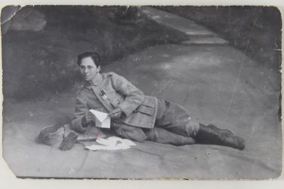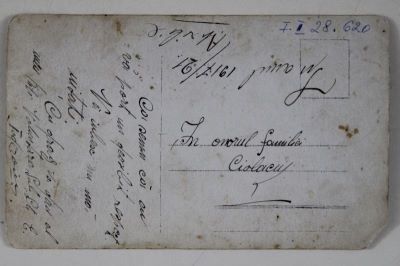 Descriere: În imagine este înfățișată eroina Ecaterina Teodoroiu în uniformă de sublocotenent. Este așezată pe podea, sprijinită pe o pernă și întinsă pe partea dreaptă. În mâini ține o scrisoare. În fața eroinei mai sunt alte documente precum și o mănușă și chipiul de la uniformă. Poartă ochelari, iar în piept se observă decorația primită, „Virtutea Militară” cls. a II-a. Pe verso, cu cerneală neagră este scris textul următor: „în onorul familiei/Ciolacu/ Ca semn că eu/vă port un deosebit respect/Vă iubesc nu mă/ uitați./Cu drag vă dau al/ meu kip Voluntara Sub.Lt. E./ Teodoroiu/ În anul 1917/21/ Aprilie”. Fotografia este tip carte poștală, iar pe verso se observă tiparul specific, textul urmând acest tipar. În colțul din dreapta sus este scris numărul de inventar cu cerneală albastră, „F II 28620”, deasupra chenarului pentru timbru. Dedesubtul acestuia este aplicată o ștampilă ovală, cu tuș negru, cu inscripția „BIBLIOTECA/ MUZEULUI/ MILITAR NAȚIONAL”. Colțurile fotografiei sunt îndoite, uzate și rupte (stânga, jos), prezentând, o tăietură de 1cm și cracliuri pe margine de jur împrejur unde este exfoliat filmul fotografic. Pe verso prezintă mai multe pete, iar cartonul este îngălbenit.