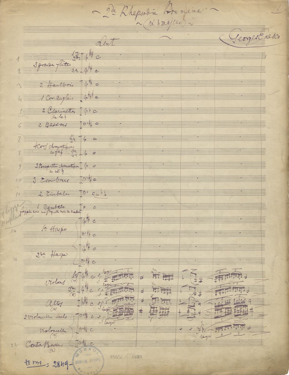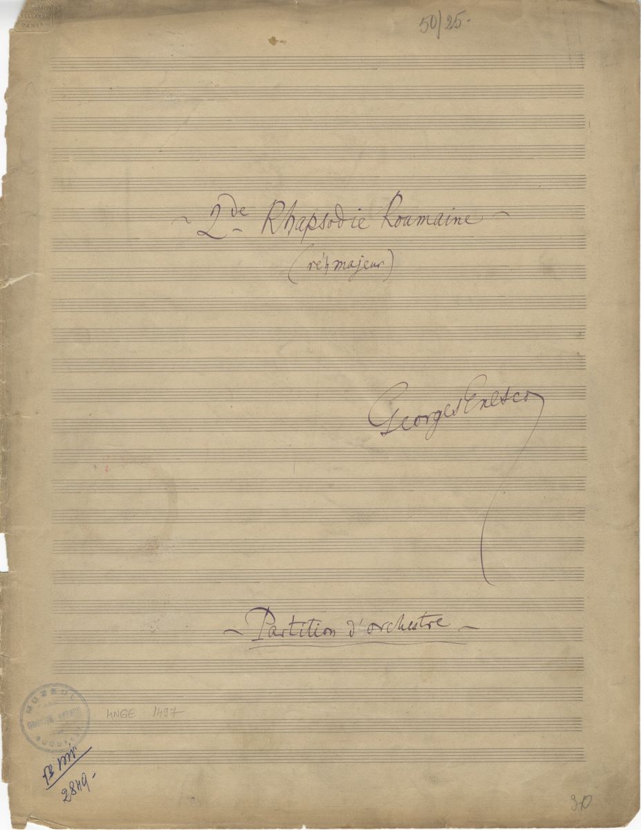 Descriere: Manuscris muzical autograf complet, intitulat ”2de Rhapsodie Roumaine (ré majeur)”, partitură pentru orchestră. Este alcătuit din 13 file/ 24 pagini completate față-verso + 1 pagină de titlu, toate completate cu cerneală violet. Prezintă diverse notații în creion. Semnătura compozitorului ”Georges Enesco”) apare pe pagina de titlu (central-dreapta), paginile nr. 1 (colțul dreapta-sus) și nr. 24 (colțul dreapta-jos). Numerotarea paginilor este cea originală, realizată de compozitor (1-24). Pagina de titlu nu este numerotată.