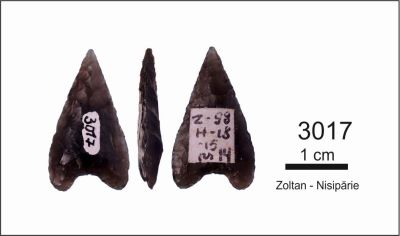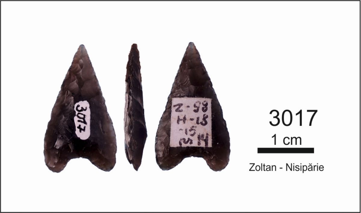 Descriere: Vârf de săgeată întreg, stare de conservare foarte bună, confecționat din silex cenușiu închis prin cioplire și retușare pe întreaga suprafață, formă triunghiulară cu margini convexe și bază concavă (scobită) pentru fixarea optimă în tija de lemn, secțiuni boconvexe plate. Urme de utilizare - nu se conservă. Armătură de săgeată (vârf). Ocupații atestate: utilizarea arcului ca armă de vânătoare sau armă de luptă.