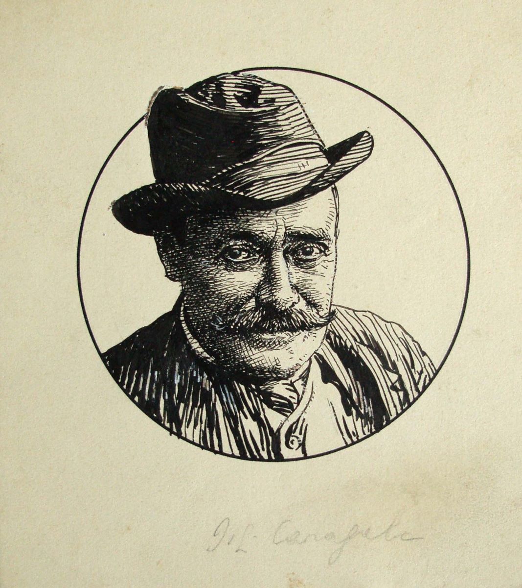 Descriere: Portret în medalion al lui I. L.Caragiale, cu care Murnu era în relații de amiciție. Portret de bărbat, cap și parțial bust, privit frontal, ușor înclinat spre dreapta. Poară mustață groasă răsucită în sus, costum cu vestă și cravată; pe cap pălărie moale, cu boruri. Privește cu blândețe spre spectator. Desen cu duct precis, incisiv și continuu, cu hașuri fine și elaborate în sugerarea carnației. Realizat după fotografie de epocă.
