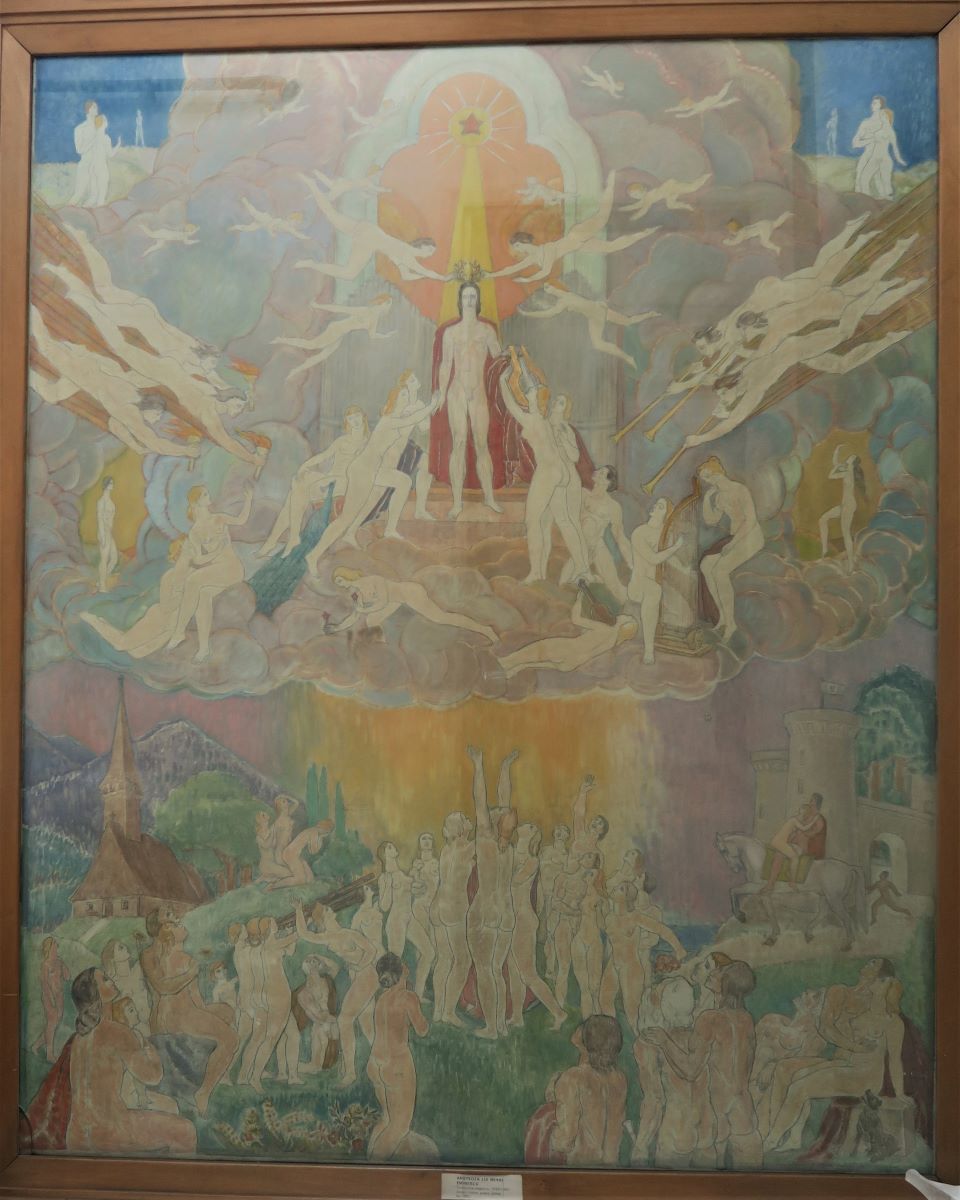 Descriere: Compoziție cu personaje împărțită în 2 registre. Registrul superior central se observă nuudul unui bărbat încoronat cu lauri și 12 nuduri femine în jurul său. Deasupra acestora se află o stea roșie care trimite raze și lumină. În registrul inferior este reprezentată o biserică de lemn, în dreapta două turnuri de cetate în fața cărora se vede un cuplu de îndrăgostiți călare pe un cal alb. În mijloc un grup de femei care slăvesc peresonajul principal din registrul superior.