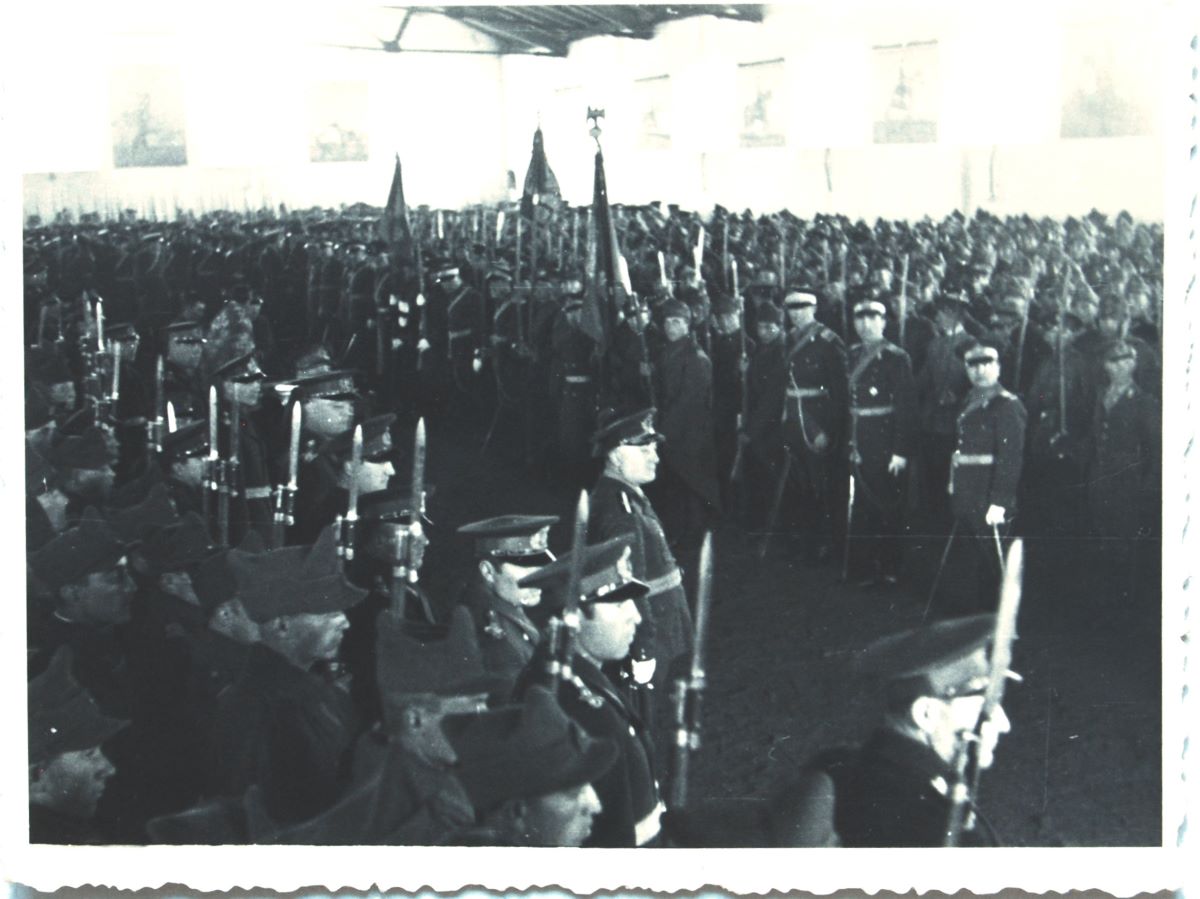 Descriere: Fotografia alb-negru reprezintă momentul depunerii jurământului Regimentului 2 Roșiori din Garnizoana Bârlad. Avem certitudinea că fotografia a fost executată în luna martie 1935, așa cum menționează cel care a donat-o, locotent colonel Mircea Tomescu. Pe verso, fotografia poartă ștampila atelierului fotografic „Foto Serviciu/Nic. Golescu, 16”, precum și înscrisul olograf, cu creion: „Locot. Tomescu”. Fotografia înfățișează Regimentul 2 Roșiori, ofițeri și soldați, dispuși în careu, aflați în interiorul clădirii Garnizoanei Bârlad. Regimentul 2 Roșiori Bârlad s-a remarcat atât prin participarea la Războiul de Independență, la al doilea război balcanic dar mai ales în Primul Război Mondial prin celebra șarjă eroică de la Prunaru. La comanda acestui regiment, de-a lungul vremii, s-au evidențiat ofițeri superiori precum Gheorghe Naumescu, Victor Dombrovski. Fotografia face parte din colecția locotenent colonel Mircea Tomescu.