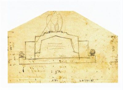 Descriere: Studiu de monument funerar, privit frontal, sub forma unei plăci masive prismatice, susținută de doi pilaștri. Placa este de amplasată pe o plintă străjuită în stg. și dr. de două torțe și este surmontată la mijloc de o pasăre stilizată, cu aripile adunate pe lângă corp , amintind de păsările lui Constantin Brâncuși. Desen sintetic, liniar, cu duct egal și continuu