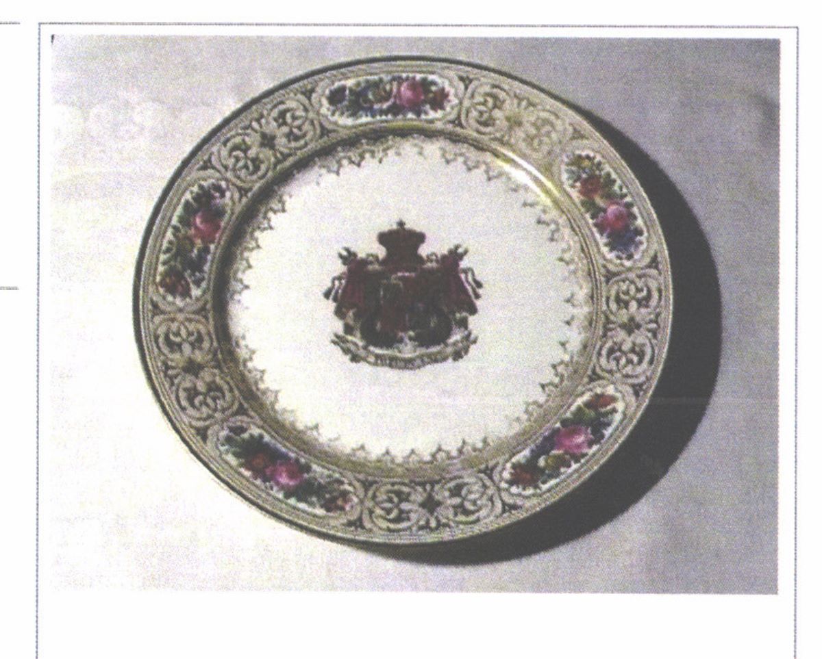 Descriere: Farfuria face parte dintr-un serviciu de masă compus din peste 100 de piese comandate la manufacturile regale din Sèvres de către familia domnitoare Cuza. Serviciul urma să fie folosit în palatul domnesc din Cotroceni. Farfuria este întinsă, circulară și pictată pe margini cu cinci medalioane florale care alternează cu arabescuri aurii. Reprezintă modelul decorativ în stil Louis-Philippe, creat în anul 1844 de către ceramistul Charles Antoine Didier, fiul. Farfuria este decorată central cu stema Principatelor Unite și deviza unionistă „Toți pentru Unu”. Stema și motivele florale se caracterizează printr-o vie policromie: galben, nuanțe de roșu, roz, verde și albastru. Pe reversul ei apar două mărci în câmp circular, „Chateaux de Trianon” (culoare roșu-carmin) și „Sevres 1846” (cu albastru). De asemenea se remarcă cartelul care conține, în cifre latine, datele dublei alegeri ale lui Alexandru Ioan Cuza ca principe al Țării Românești.
