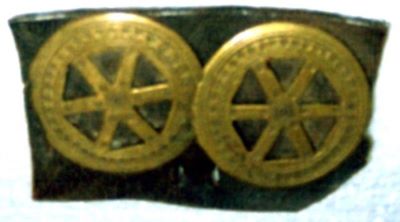 Descriere: O pereche de paftale, de formă rotundă cu șase spițe; decor geometrizant realizat prin ștanțare, motive geometrice: cerc, rozetă; culoarea metalului.