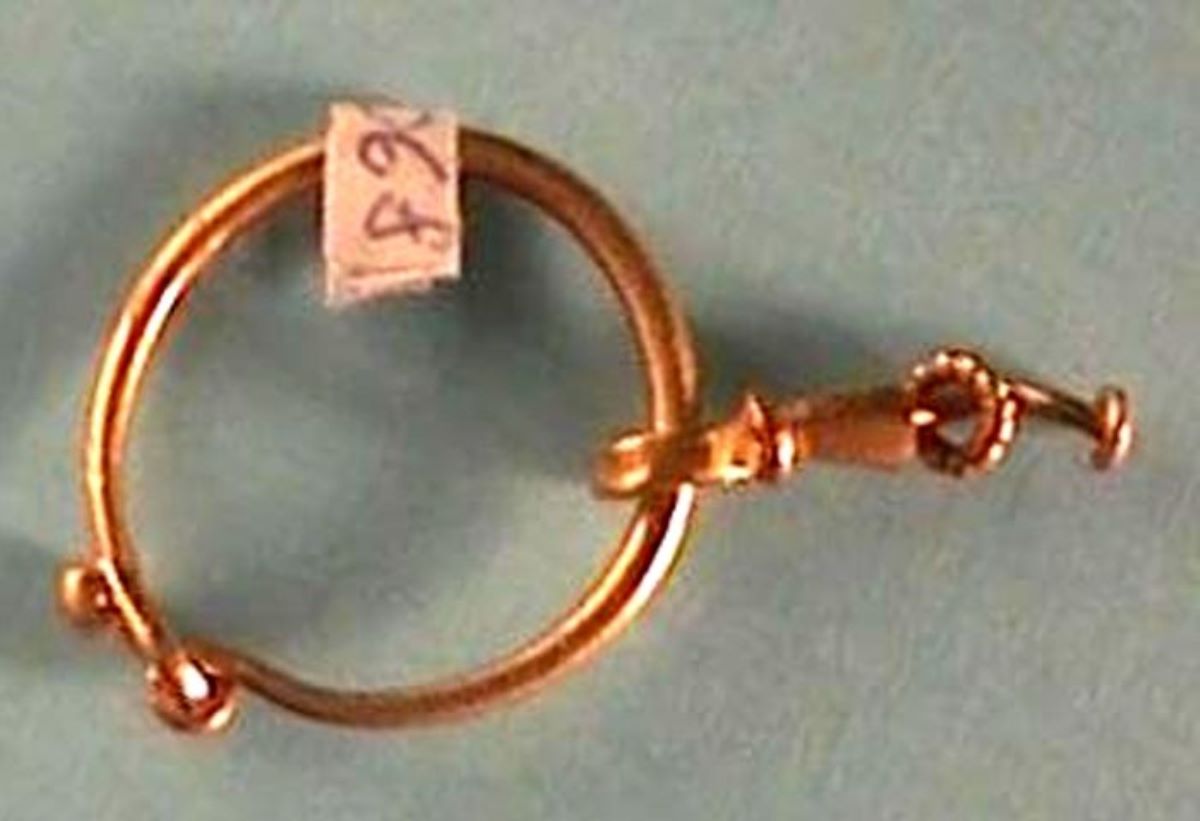 Descriere: Verigă cu profil circular, cu pandantiv piramidal și fir terminat în nod, cu două inele perlate (unul mobil).
