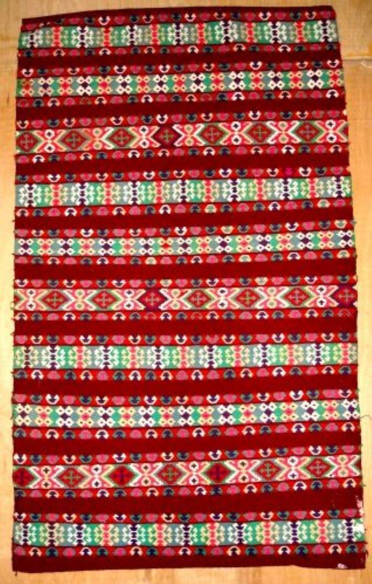 Descriere: Formă dreptunghiulară, decor amplasat pe toată suprafața cu motive geometrice sub formă de romb, cruce dreaptă înscrisă în romb, coarnele berbecului și rac, dispuse în registre orizontale în alternanță cu vergi roșii de diferite lățimi. Cromatică: vișiniu, roșu, alb, verde, albastru, piersiciu, galben.