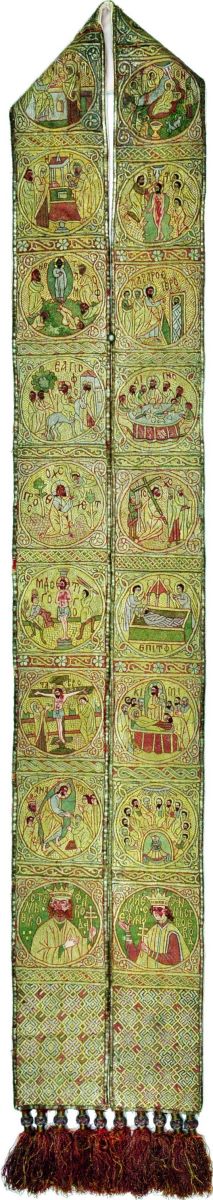 Descriere: În partea superioară a veșmântului este înfățișată Cina de la Mamvri iar de-a lungul celor două benzi, în 16 medalioane, dispuse două câte două pe opt registre sunt brodate 16 icoane nou-testamentare: Bunavestirea și Nașterea, Aducerea la templu și Botezul, Schimbarea la Față și Învierea lui Lazăr, Intrarea în Ierusalim și Cina cea de taină, Rugăciunea de pe muntele Măslinilor și Patimile, Biciuirea și Răstignirea, Punerea în mormânt și Adormirea Maicii Domnului, Coborârea la iad și Pogorârea Sfântului Duh. Dedesubtul acestora apar două medalioane cu portretele lui „Ștefan voievod” și „Alexandru, fiul lui Ștefan voievod”. La capetele celor două benzi sunt brodate simboluri bizantine: două litere de C adosate și patru bare intersectate, care se regăsesc și pe acoperământul de mormânt al doamnei Maria Asanina Paleologhina.