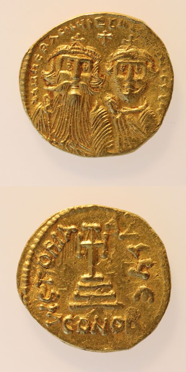 Descriere avers: Legendă dispusă circular pe margine. Bustul cu barbă lungă a lui Heraclius în stânga, bustul lui Heraclius Constantin cu barbă scurtă în dreapta, ambele reprezentate frontal. Amândoi poartă diademe crucigere și sunt drapate. Cruce între capetele lor. Cerc perlat exterior parțial vizibil.