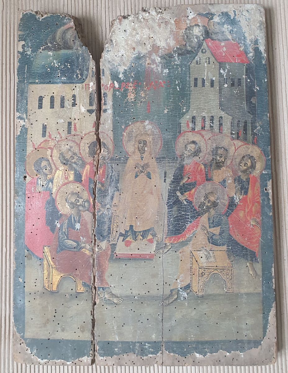 Descriere: Maica Domnului, cu mâinile împreunate în rugăciune, este așezată între două grupuri de apostoli, din care individualizați sunt doar câte trei și încă doi situați în prim-plan, pregătiți să scrie despre evenimentul miraculos la care asistau. Arhitecturi înalte se profilează în fundal, deasupra cărora se ridică nori negri. Panoul este crăpat și puternic afectat de deteriorări.