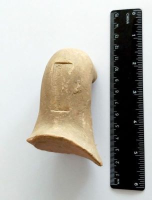 Descriere: Toartă de amforă fragmentară, se păstrează partea superioară ce se prindea de gâtul amforei. Poartă o ștampilă rectangulară cu numele fabricantului rhodian Menekrates 2, activ în perioada 180-160 a.Chr. Pastă fină, curată, bine frământată, cu foarte mici particule de mică, arsă oxidant și uniform, culoare roz-pal, tipică pentru amforele de Rhodos.