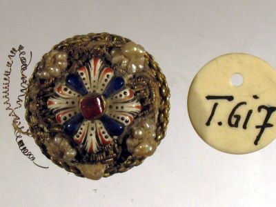 Descriere: Ac de voal pentru port popular săsesc, în formă florală, cu decor spiralat, monturi de perle mici, o sticlă roșie și petale pictate cu email.