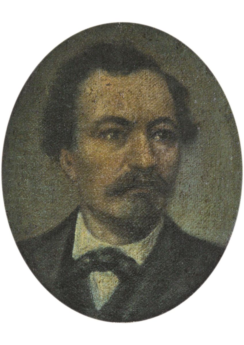 Descriere: Probabil portret de învățător. Portret de bărbat în medalion, privit din trei sferturi spre dreapta, cap și parțial bust. Poartă părul tăiat scurt, mustață și barbișon, cămașă cu legătură înnodată la gât și redingotă. Pictură de factură lisă, cu degradeuri de culoare, în armonii preponderent reci. Lucrare convențională, realizată probabil după o fotografie, în manieră realist- academică.