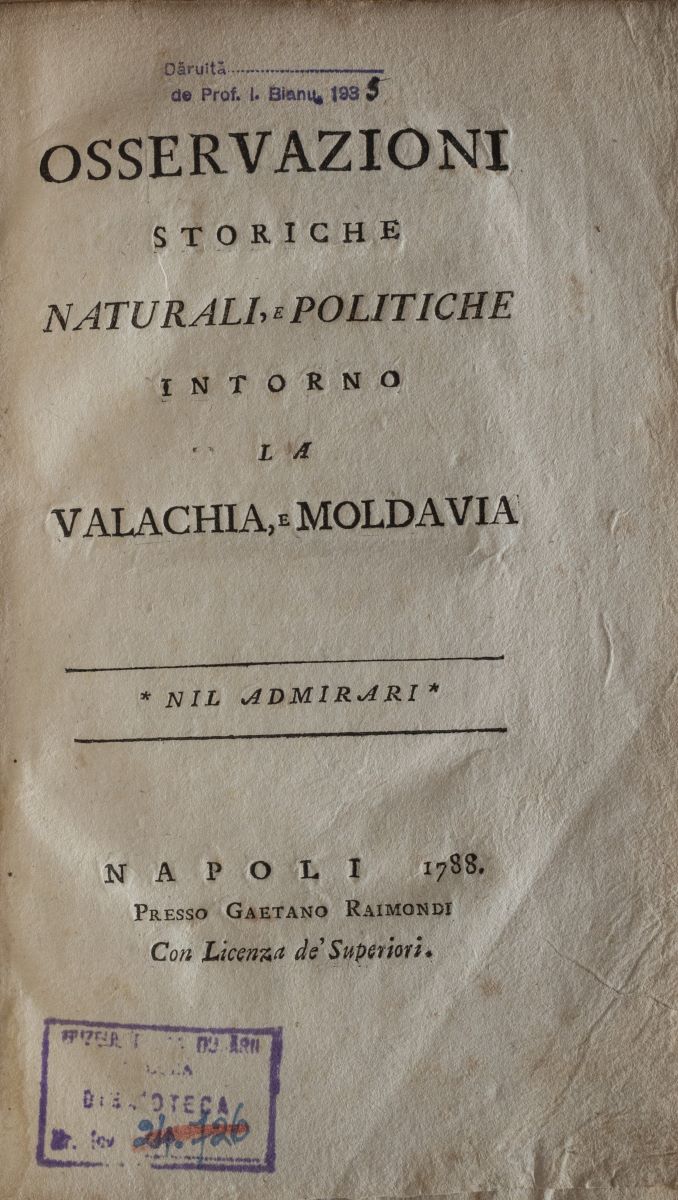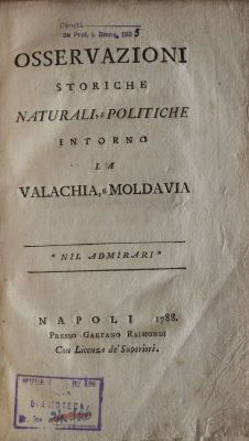 Titlu: Osservazioni storiche naturali, e politiche intorno la Valachia, e Moldavia