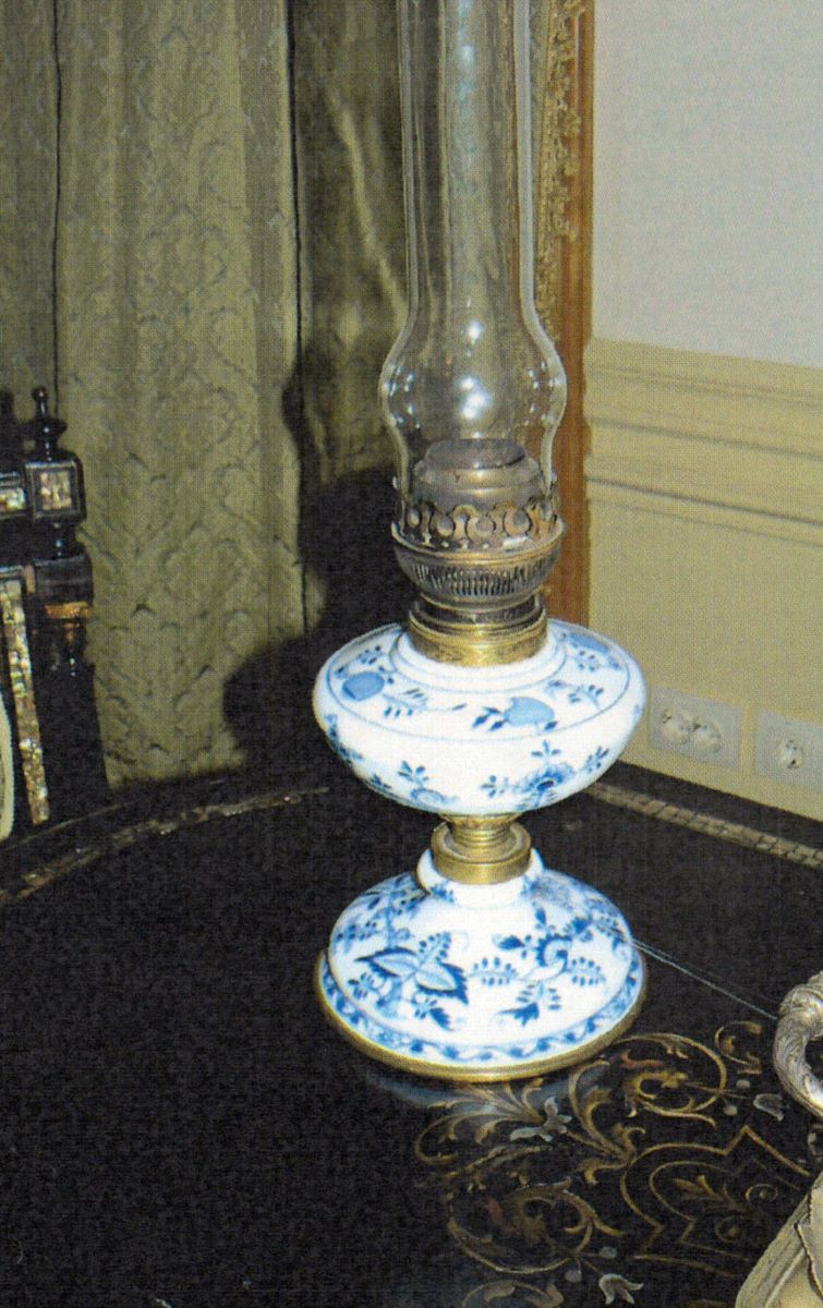 Descriere: Lampă din porțelan alb cu motive florale de culoare albastră, pictate manual. Este formată din două corpuri prinse printr-o garnitură de alamă de suportul-picior cu sușe cu piuliță. Pe sticla de cristal este gravată în stea marca producătorului: MATADOR BRENNER. A aparținut familiei Kogălniceanu după mărturia ofertantului. Mihail Kogălniceanu a fost prim-ministru al României după Unirea din 1859, ministru al Afacerilor Externe sub Carol I, politician de orientare liberală, avocat, istoric, scriitor publicist, originar din Moldova.