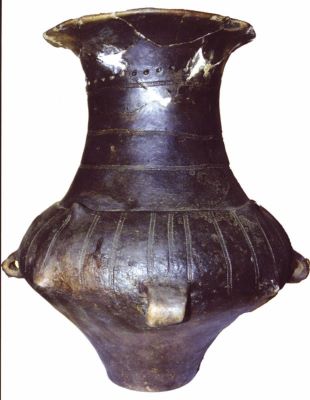 Descriere: Amforă globulară, cu buza evazată. Diametrul maxim al vasului se află în zona pântecului. Gâtul amforei este decorat prin benzi orizontale realizate prin tehnica pseudo-șnurului și impresiuni circulare. Pântecul vasului este decorat prin șiruri verticale realizate prin tehnica pseudo-șnurului. De asemenea, în această zonă sunt amplasate patru toarte, precum și patru perechi de proeminențe conice, care marchează limita inferioară și superioară a pântecului.