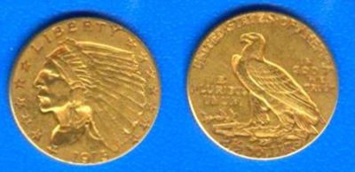 Descriere revers: Acvilă cu aripile strânse, șezând pe snop de săgeți (forța Războiului) și ram de măslin (forța Păcii). Sub vultur legenda 2 1/2 DOLLARS. În fața vulturului legenda pe trei rânduri E/ PLURIBUS/ UNUM. În spatele vulturului legenda pe patru rânduri IN/ GOD/ WE/ TRUST (moto). Bună. Mici zgârieturi pe ambele fețe.