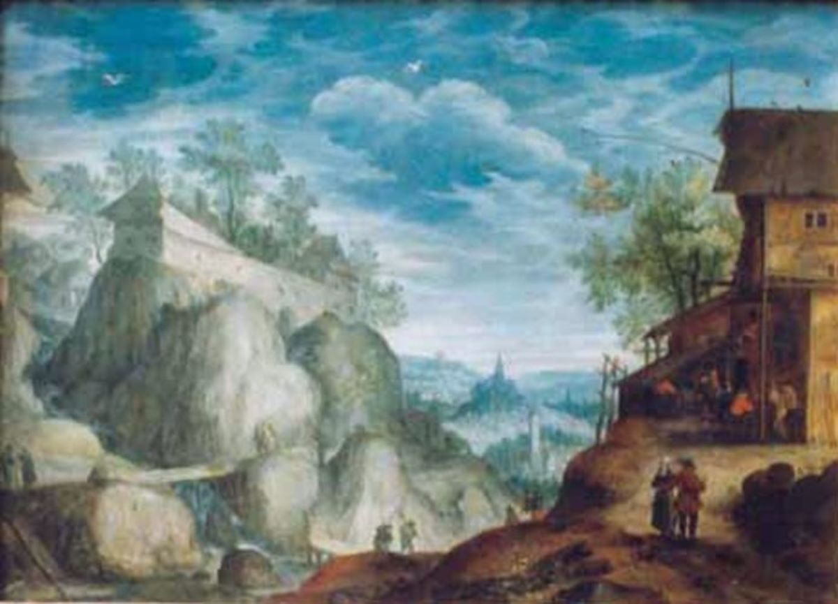 Descriere: Peisajul realizat de Stevens dupa o gravură a lui Aegidius Sadeler, concepută de Roelandt Savery este mediația între priveliștea panoramică bruegeliană și peisajul gândit, raționalizat. Adâncimea spațială realizată prin planuri succesive, apropiate de orizontală, ce alternează de fiecare parte a axului spațial oblic este expresia unei atmosfere poetice, filtrate de om. Imaginea realizată are un aer majestuos dar este lipsită de ostentație și grandilocvență. Peisajul lui Stevens urmează principiile structive ale artei flamande și le aplică la temele italiene, dispunându-le în planuri largi, în raporturi simple și clare de orizontale și verticale, la care se adaugă inflexiunile discrete ale unor curbe, un spațiu concav, bogat în elemente "mobilante". Stevens se folosește de construcția peisajului de tipul culisant, unind arborele și muntele cu întinderea câmpiei, pășunea însorită cu munte umbros, perspectiva departată cu viața apropiată, familiară și pașnică a satului. Spațiul este organizat pe verticale întunecate /culise/, arborii sau colinele ce mărginesc o deschidere sau mai multe, sunt inegale și coboară spre orizontul îndepărtat al priveliștii. Dotat cu un simț estetic care elimină detaliile naturiste, Stevens păstrează structura tritonală: albastru intens, verde, brun. Definește prin culoare și lumină frunzișul, obligând lumina, atât ca intensitate cât și ca valoare cromatică, să joace un rol constructiv în recompunerea optică a spațiului. Istoricul atribuirii lucrării este interesant de urmărit de la achiziționare și până în 2001. În Älterste catalog, Gemälde Galerie și Führer durch este înscrisă ca aparținând școlii neerlandeze. În anul 1894 Frimmel face mențiunea "stilului lui Paul Bril, înainte de 1600", iar Csaki (1901 și 1909) o atribuie lui Paul Bril. Atribuirea făcută de el a fost contestată în decursul anilor de către personalități consacrate, printre aceștia numărându-se: Leo van Puyvelde (cf. coresp., 1964), Walter Bernt (cf. coresp. 1967), B. Renckens (cf. coresp., 1968), Yvonne Thiery (cf. coresp., 1968), Jean Max Tassel (opinie verbală, 1900), Marijke de Kinkelder (opinie verbală, 1998) și Luuk Pijl (opinie verbală, 2000). Walter Bernt (1967) nu se pronunță pentru cineva, dar se gândește la cercul lui Roelant Savery. Yvonne Thiery (1968), împărtășeste ideea lui W. Bernt, continuând-o cu remarca "lucrarea pare mai mult opera unui imitator înspre 1600" și sugerează numele lui Pieter Stevens "care a pictat imagini cu Roma și peisaje tiroleze". Fred Meijer (opinie verbală, 2001) infirma categoric vechea atribuire și este cel care descoperă minuscula semnătură a lui P. Stevens. Ținând cont de existența semnăturii și luând în considerare opiniile exprimate de cunoscuții istorici de artă, suntem în asentimentul lor în atribuirea lucrării "Peisajul muntos cu cârciumă țărănească" lui Pieter Stevens cel Tânăr. Semnat dreapta jos: P. Stevens.