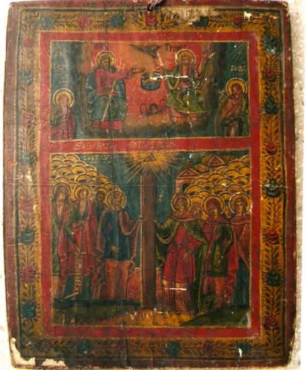 Descriere: Piesă de formă dreptunghiulară. Icoana face parte din icoanele de praznic care se puneau pe tetrapod; se puneau in interiorul locuințelor pe peretele de la răsărit. Spațiul icoanei este împărțit în două scene: în partea superioară icoana Sfintei Treimi cu Iisus stând la dreapta Tatălui purtând crucea, între ei globul cruciger iar deasupra, în nori, Sf. Duh. În colțurile de jos apar doi sfinți: Sf. Ilie și Sf. Ioan. În partea inferioară Sf. Constantin și Elena susțin crucea reprezentată fără traverse cu “ochiul lui Dumnezeu” înscris într-un triunghi înconjurat de raze. În spatele lor sunt reprezentați mulțimi de sfinți și sfinte. Scena iconografică este încadrată de două chenare roșii bordate cu alb precum și un chenar cu flori roșii și albastre, alternate ritmic, legate prin ramuri cu frunze dispuse simetric de o parte și alta a tijelor. Fond: albastru; motive: alb, roz, negru, verde, vernil, grena, maron, galauriu.