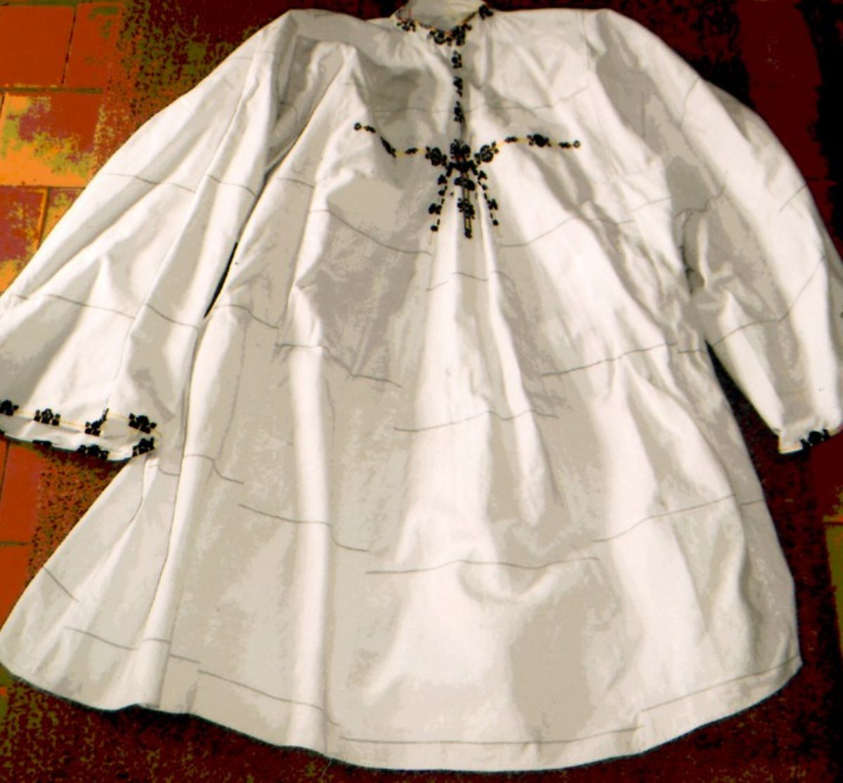 Descriere: Cămașă bărbătească realizată din fâșii de pânză, ușor evazate, având în țesătură vărguțe roșii transversale, cu despicătura dreaptă; de la despicătura pornește un clin trapezoidal. Pe piept și în jurul despicăturii și al gulerului îngust, se observă ornamente florale stilizate și geometrice care formează o cruce denumită - barbure. La baza despicăturii sunt brodate inițialele "M", "I", "J". Mânecile sunt largi, având la bază motive florale stilizate. Spatele prezintă aceleași ornamente sub formă de "cruce" și litera "M". Cromatică: alb, negru, galben.