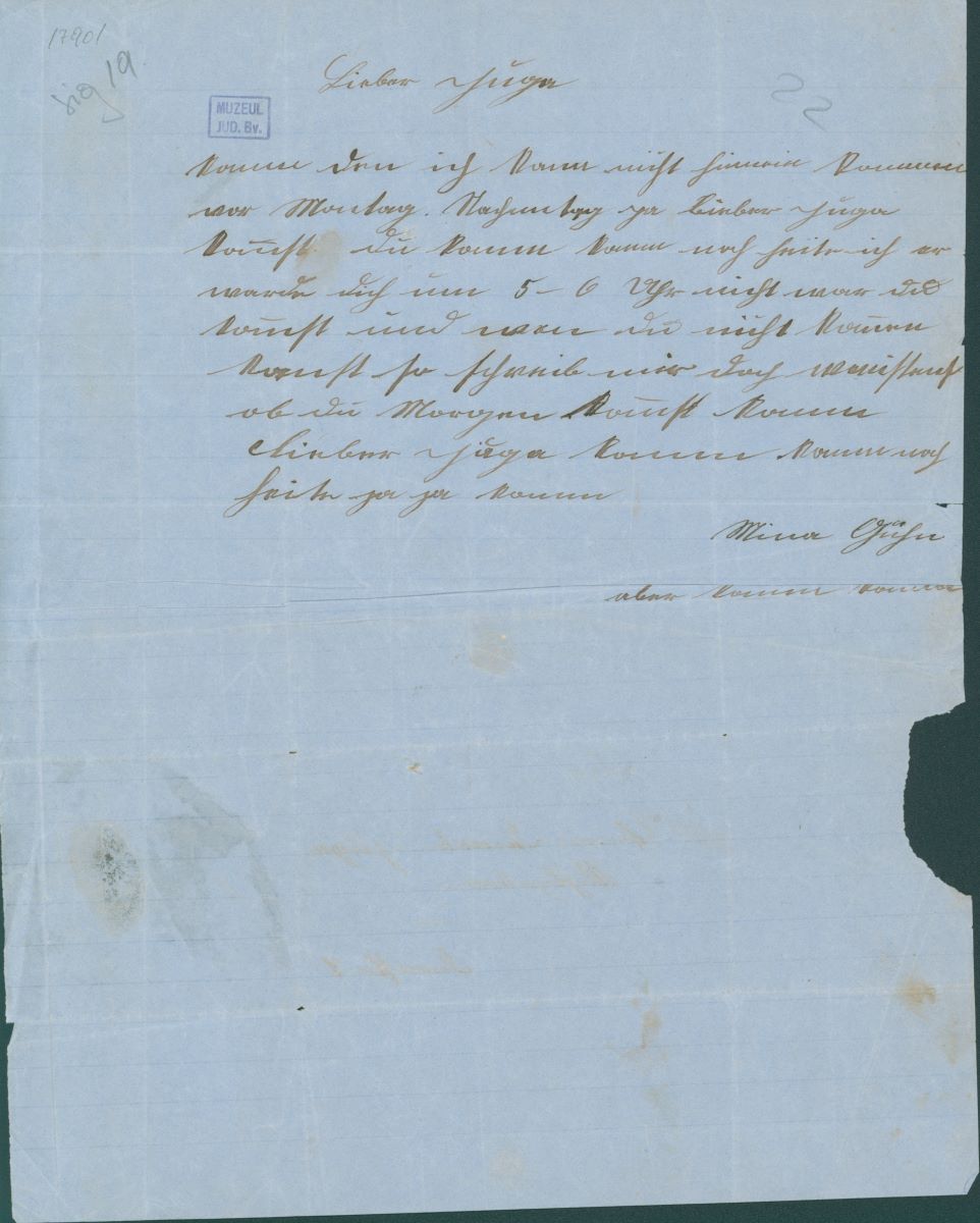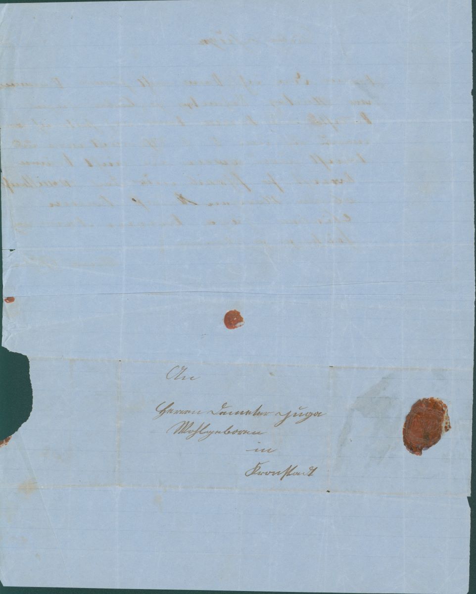 Descriere: Scrisoare în limba germană adresată negustorului Iuga Dimitrie din Brașov. Documentul are aplicat pe a doua pagină o amprentă sigilară, în ceară roșie, cu monograma „W.D.”
