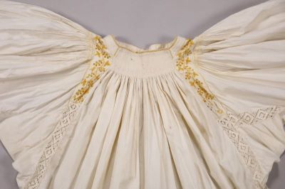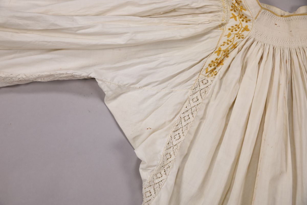 Material/Tehnică (text): Pânză industrială (jolj), dantelă, bumbac, muline/ țesut industrial, croit după tipar, asamblat, brodat pe încreț, brodat în punctul de coasere plat, cruce,și cu găurele, cusut de mână