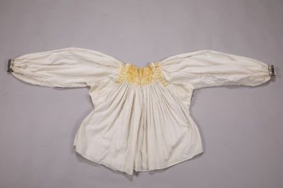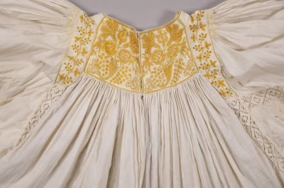 Descriere: Cămașă de formă dreptunghiulară, desfăcută în față ,confecționată din trei bucăți de pânză albă din bumbac (piept, spatele) mânecile lungi cu aspect bufant, încrețite pe umăr sunt prinse de gâtul cămăși cu o fâșie de pânză lată de 4 cm decorată cu broderie florală lucrată în tehnica broderiei sparte; la baza gâtului sunt aplicate două plătci dreptunghiulare brodate cu motivul fitomorf conul abundenței compus din floarea soarelui, garoafe, rodie, ciorchini de struguri cu frunze; Brodat anul 1902 și inițialele GT; manșete (pumnași) decorate cu broderie neagră cu motive geometrice stilizate; cromatică: fond (alb); galben, maro, negru, roșu, alb