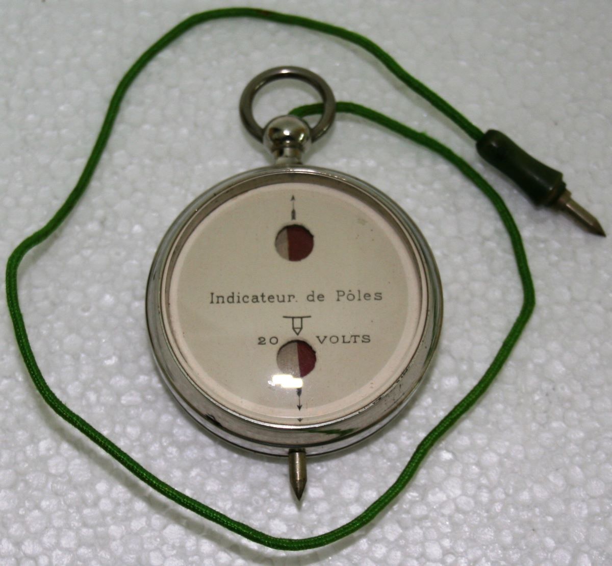 Descriere: Aparatul este de formă circulară asemenea unui ceas de buzunar, cu cadran de metal protejat cu sticlă, folosit pentru determinarea polarității bateriilor de la 0 la 20V. Aparatul este pastrat într-o poșetuță din piele de căprioară. Era utilizat în special de constructorii de aparate de radio. Pe cadran sunt două vizoare circulare mici situate pe axa verticală de simetrie prin care se poate citi polaritatea pozitivă sau negativă marcată prin culorile alb și roșu. Aparatul este prevazut la partea superioară cu o fișă - un cablu din cupru cu izolație de material textil de culoare verde și tester ascuțit din metal izolat cu ebonită. La partea inferioară a aparatului se află un tester de metal legat solidar de carcasa aparatului.
