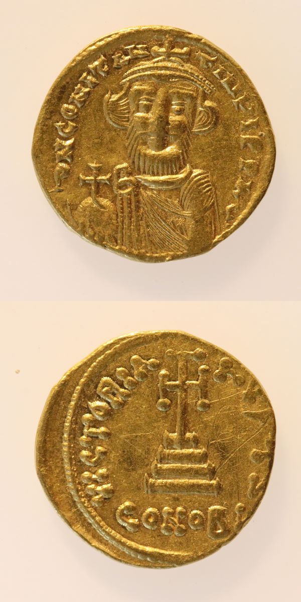 Descriere avers: Legendă dispusă circular pe margine. Central, bustul împăratului cu barbă scurtă, purtând diademă cruciată și chlamys. În mâna dreaptă glob cruciger. Cerc perlat exterior parțial vizibil.