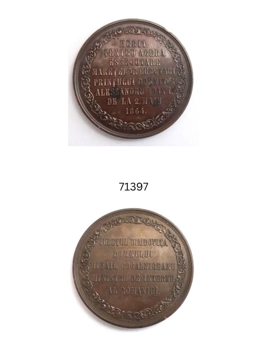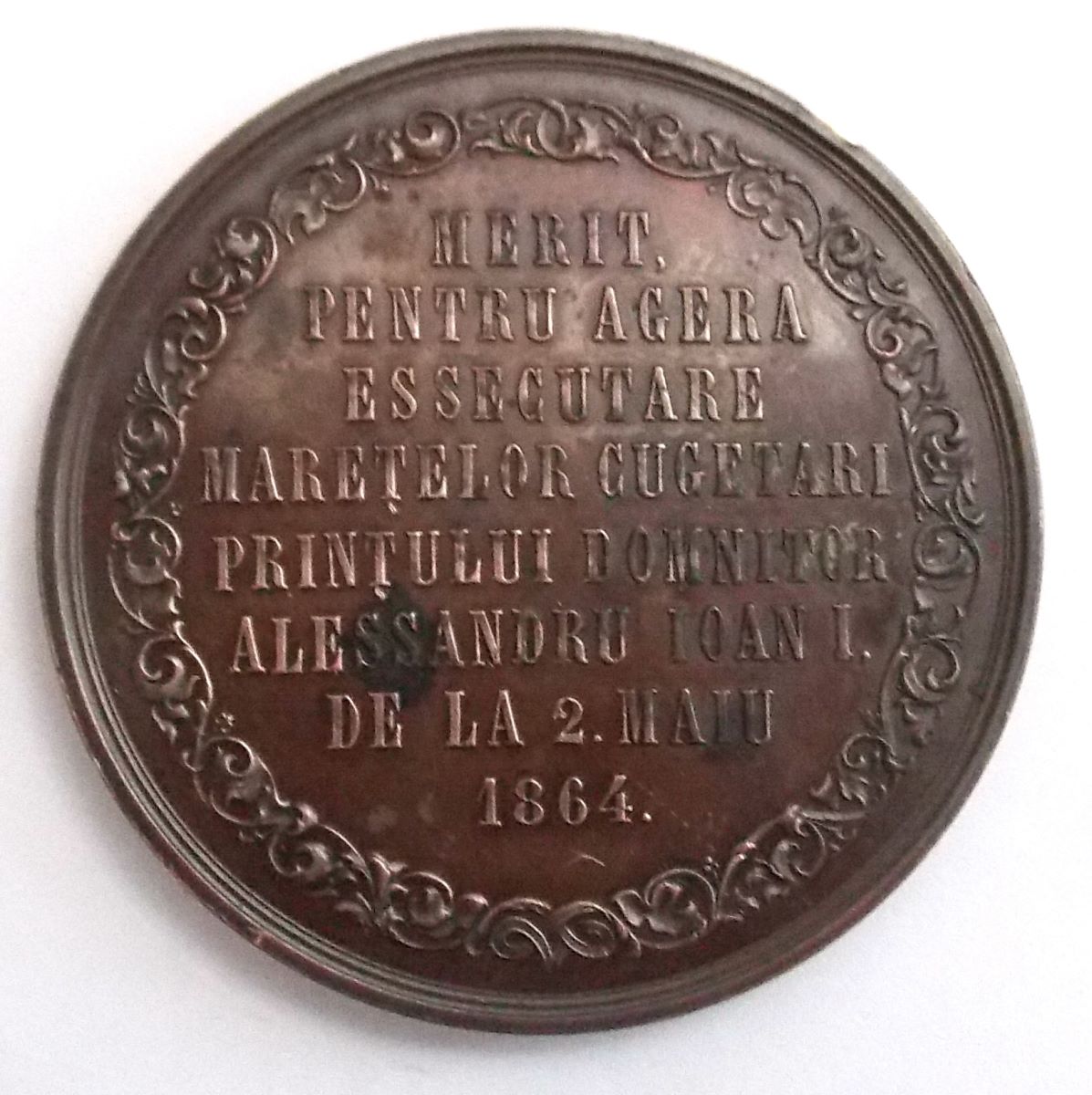 Legendă revers: MERIT// PENTRU AGERA / ESSECUTARE/ MĂREȚELOR CUGETĂRI/ PRINȚULUI DOMNITOR/ ALESSANDRU IOAN I. / DE LA 2 MAIU/ 1864