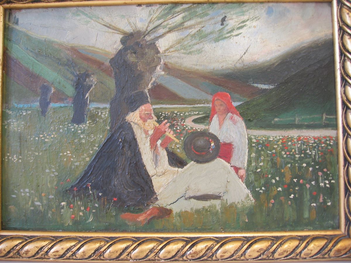 Descriere: Compoziție cu trei personaje care stau pe o pajiște înflorită, lângă un trunchi de răchită. Pozițiile celor trei țărani-bărbat, femeie și copil formează un triunghi. Atmosfera este idilică.