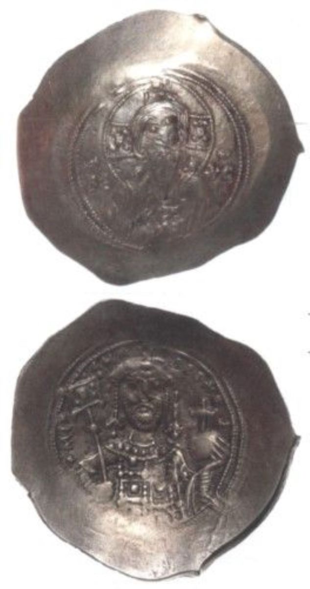 Descriere revers: Bust frontal Mihail VII cu barbă; poartă stemma, este îmbrăcat cu clapotos loros și maniakion; în mâna dreaptă ține un labarum, iar în mâna stângă ține un glob cruciger.