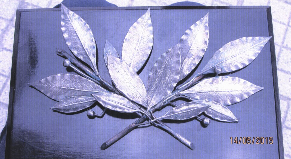 Descriere: Placă decorativă cu caracter omagial din lemn lăcuit negru decorată cu ramuri de laur simbol al gloriei nemuritoare și al cunoașterii tainice. Lucrarea, realizată în manieră art deco, a fost dăruită de Primăria Municipiului Lugoj, oraș binecunoscut pentru tradiția sa în domeniul muzical, în 7.X.1937 cu ocazia concertului susținut în cadrul turneului prin țară.