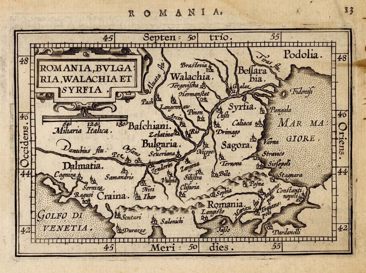 Descriere: Sunt reprezentate pe hartă Rumelia, cu vechea denumire de Romania, Bulgaria, Valahia, Syrfia (Dobrogea), Basarabia, precum și cursul inferior al Dunării și Marea Neagră (Mar Magiore). Mai cuprinde Golful Veneției, Dalmația, Constantinopolul și parte din Grecia. Localitățile sunt marcate prin diverse simboluri de cetăți iar apele păstrează vechile denumiri latine. Titlul este gravat în stânga sus, într-un cartuș ornat cu volute iar sub acesta este reprezentată scara hărții, Miliaria Italica. În chenarul marginal gradat sunt prezentate și punctele cardinale: Occidens, Meridies, Oriens, Septentrio. Este planșa cu nr. 13 dintr-un „Atlas Minor”, inspirată după hărțile lui Honterus sau Ortelius. Pe verso, conține un chenar ornamental, în registrul superior, și un text cu diverse regiuni de pe glob, imprimat pe trei coloane, cu titlul „INDEX TABVLARVM”.