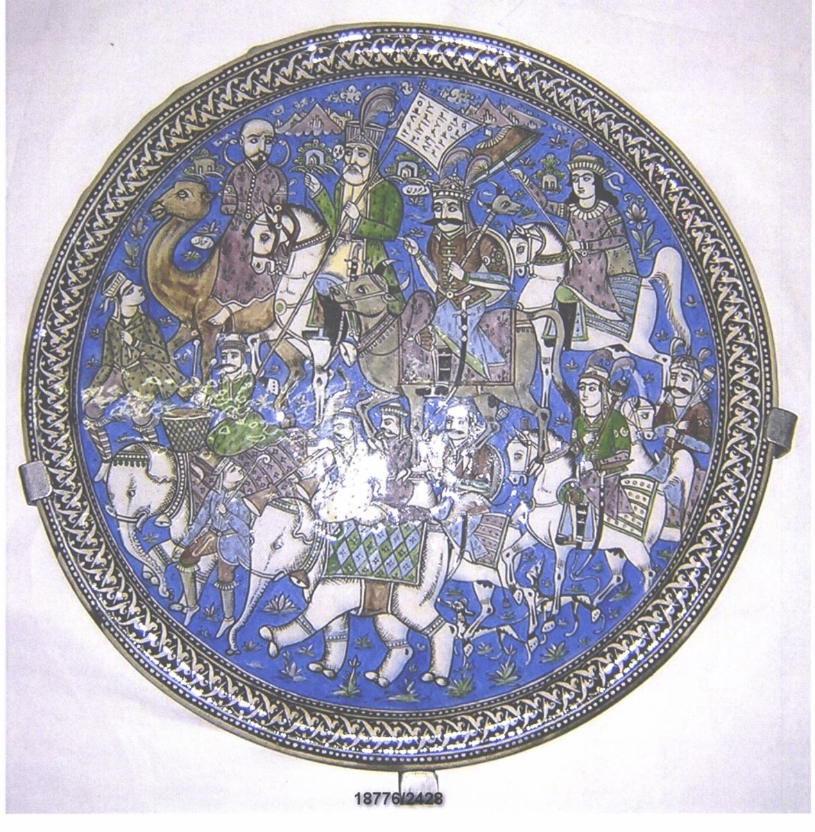 Descriere: Pe fond albastru, scenă din epopeea Shah Nameh reprezentând cortegiul care îl duce pe tiranul Zahhak la muntele Damavand pentru a-și ispăși pedeapsa. Zahhak, din umerii căruia ies doi șerpi, este reprezentat călare pe o cămilă. În stânga sa se află fierarul Kaveh, într-un veșmânt verde și purtând un stindard pe suprafața căruia apar cifre arabe. În stânga lui Kaveh, tânărul rege Fereydun, călare pe un taur. Compoziție complexă, cu numeroase personaje numeroase și animale diverse, este înconjurată de un chenar cu motive vegetale stilizate, pe fond alb.