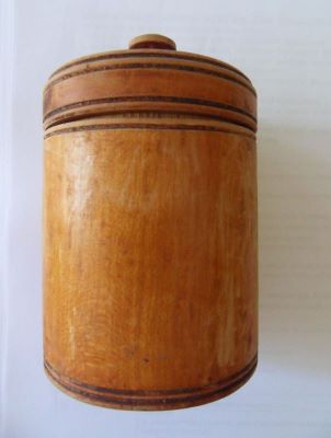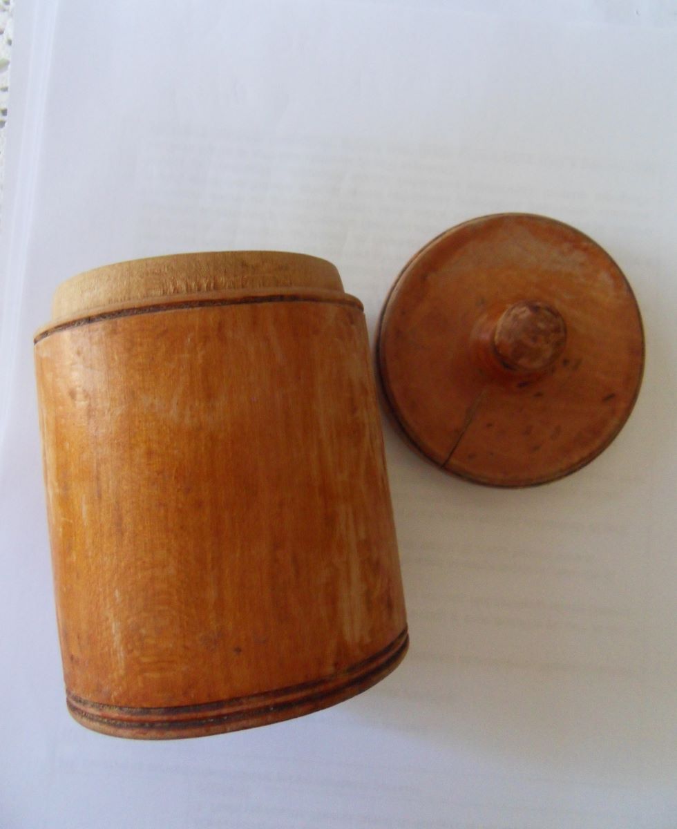 Descriere: Piesă de uz casnic confecționată din lemn de mesteacăn strunjit rotund cu capac din lemn de aceeași esență, capacul de sus fiind prevăzut cu mâner rotund. Decorul simplu constă în linii circulare pe anumite porțiuni ale suprafeței cilindrice. Cromatica: galben.