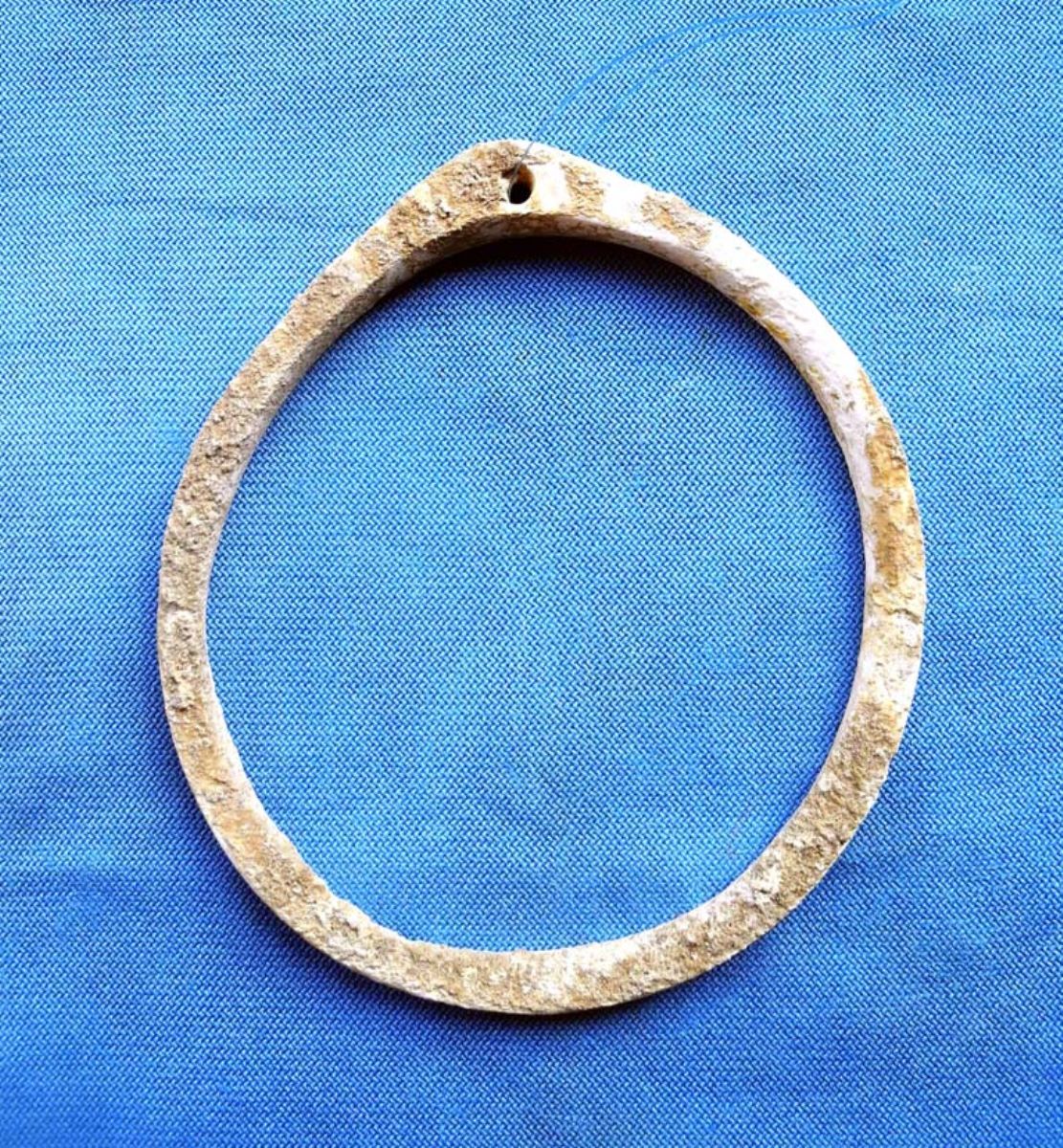 Descriere: Brățară din scoică marină, Glycimeris, de culoare alb-gălbuie, de formă ovală, lucrată prin șlefuire și perforare. Obiect de prestigiu.